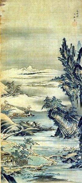 作者 菊田伊洲。時代 江戸時代後期。品質形状 絹本著色 一幅。説明 狩野元信<かのうもとのぶ>の図に倣って描かれたもの。