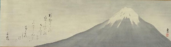 作者 東東洋 加藤千蔭賛。時代 江戸時代後期。品質形状 紙本墨画 一幅。説明 本図は横長の画面右よりに薄墨だけで富士山を描く。落款、印章から法橋叙任前、比較的若い頃の作品と推測される。  画面左に記された賛は加藤千蔭〔享保20(1735)~文化5(180 8)〕の手になる。千蔭は江戸の与力、賀茂真淵の門人、和歌と能 書で名高い人物である。