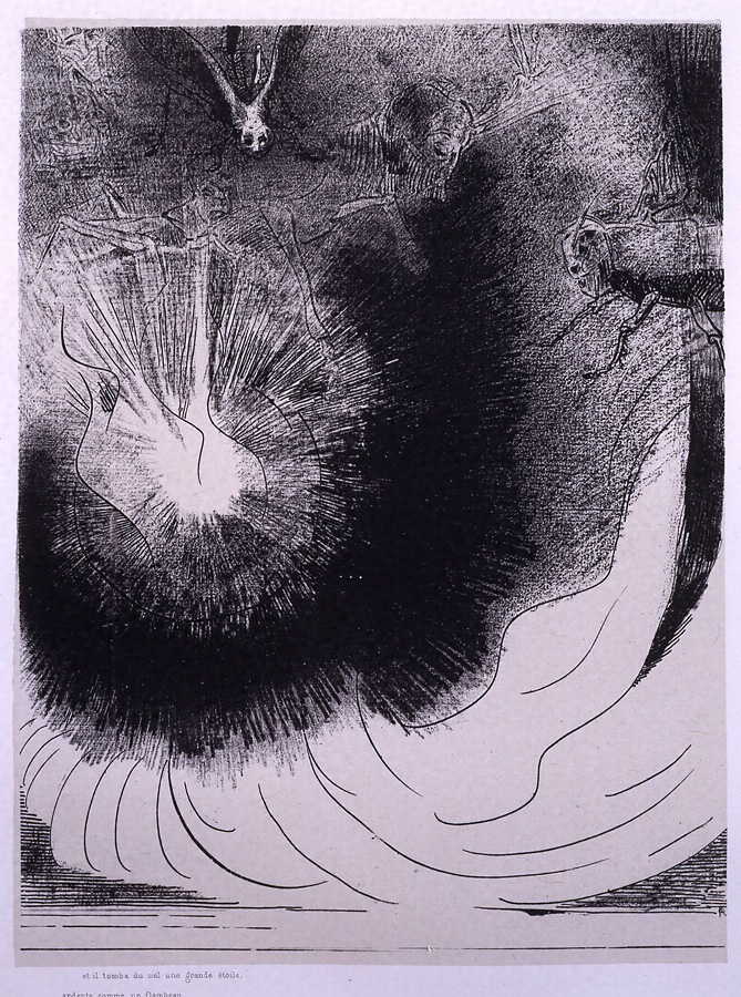 第七の封印が解かれた後、7人の天使が次々に七つのラッパを吹く。第3の天使がラッパを吹き鳴らした時、「にがよもぎ」と呼ばれる松明(たいまつ)のような星が落下して、川と水源との上に落ち、苦くなった水のために大勢の人々が死に絶えた。ここに引用されたテキストは黙示録第8章に記されているが、ルドンはこの場面に、第9章冒頭のテキストに基づくいなごの描写を付け加え、一つの画面に二つの章より採られた内容を重ね合わせている。第9章では天から地に落ちてきた星が、底知れぬ所の穴を開いたところ、大きな煙が立ち昇り、その中から、額に神の印がない人聞に危害を加える蠍(さそり)のようないなごが現われる。ルドンは章の異なる二つの物語を、「天から地に落ちる星」という劇的なヴィジョンによって結合させた。画面左側には炸裂する燐光が見られ、燐光の周りには黒煙が描かれ、さらにその周辺部には旋風を引き起こす光の渦が大胆に配置された。画面上方には数匹の巨大ないなごが空中を浮遊している。1913年にルドンの版画をまとめて作品カタログを作成したアンドレ・メルリオは、画面上部真中に水牛が描かれていると注意を促しているが、『黙示録』第8章及び9章のいずれの頁を開いても、水牛に関する記述は見当らない。むしろ、そのいなごのもつ四足獣に似た脚は、第9章7の「出陣の用意のととのえられた馬」を想わせるのであり、さらに「その顔は人間の顔のようであり、また、そのかみの毛は女のかみのようであり……」という記述にも係っているのではないかと思われる。さて、画面全体の印象を述べれば、この作品はこの石版画集の中でも、最も黙示録的といえる劇的表現を誇るものといえるであろう。ここでは他の11枚の版画には表現され得なかった、黙示録の主要モティーフとしての横溢する喧騒の世界が律動的に視覚化された。しかも注目すべきことに、やはり他の作品とは相違して、銅版画的特質を示す明確な描線の動勢が画面を力強く引き締めている。らなみにデューラーの方はといえば、ルドンの直観的な幻覚描写とは対照的に、「七人のラッパを吹く天使」(→[4])の画面左下において、地上の井戸をめがけて一直線に落下してゆく星が、多少とも説明的な運動表現を伴って描かれ、いなごのモティーフは画面右下に添えられただけである。(中谷伸生)