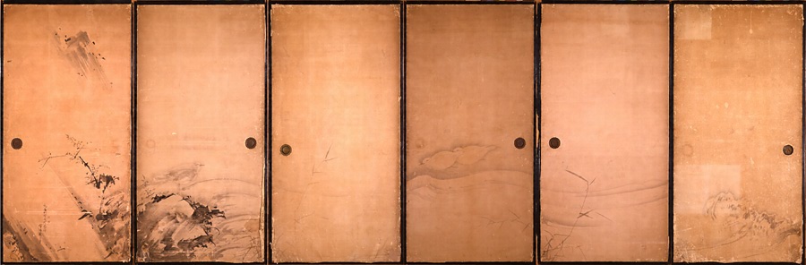 淡墨を多く用いて、余白を多くとった本図は、「波濤群鶴図」とはかなり異なった印象の作品となっているが、そうした両図の 表現の差は、同一室内における空間構成を考慮してのこととも 考えられる。