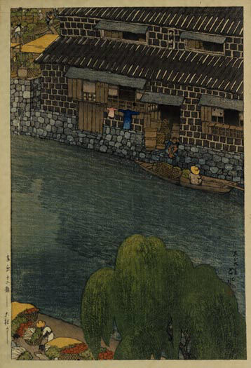 川瀬巴水(1883ー1957)は東京の生まれ。本名文治郎。荒木寛友らに絵の手ほどきを受ける。鏑木清方に入門を請うが容れられず、清方の勧めで白馬会葵橋洋画研究所で洋画を学び、岡田三郎助にも指導を受けた。明治四十三年清方に入門を許され、巴水の号を受ける。大正七年、同門の伊東深水の木版画「近江八景」を見て版画への関心を喚起され、同年渡辺庄三郎の知己を得て初めて版画を出版。創作版画運動に対して、伝統的な木版技術による新様式の開拓をめざす渡辺版画には、深水の他橋口五葉、山村耕花、名取春仙らが加わっていた。巴水は中でも写生に基づく風景版画に独自の世界を切り開いた。