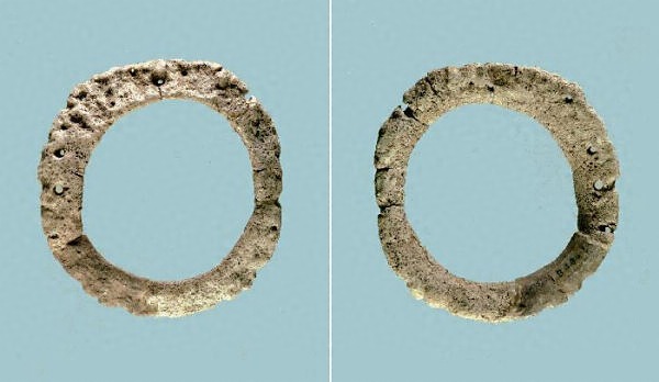 鹿の角の根元の部分を加工してつくった腕輪。最大径7.2cm。縄文時代。河北町南境貝塚。