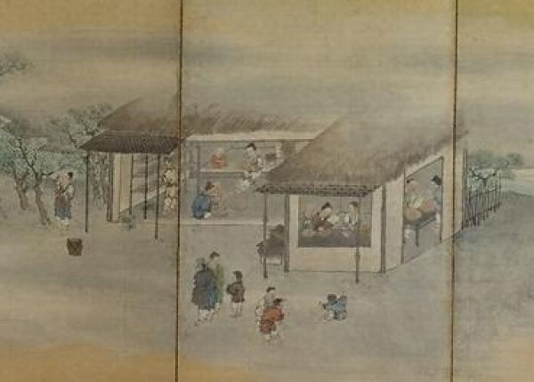 作者 東東洋。時代 天保元年(1839)。品質形状 絹本著色 六曲一双。説明 耕織図とは、中国絵画の画題の一つであり、農民の勤労を絵画によって天子に示したことが起こりである。本図では左隻に農耕、右隻に養蚕の過程を中国の風俗、風景で描く。