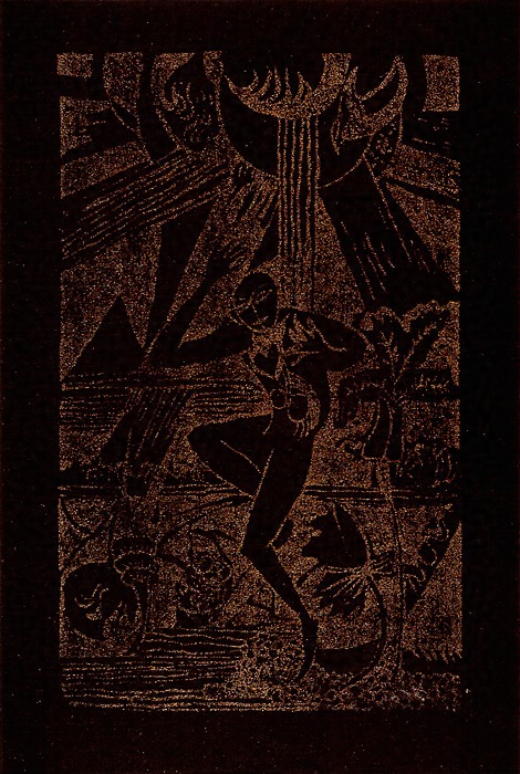 1914年、田中恭吉は、友人の恩地孝四郎の紹介により、かねてから田中の作品に注目していた詩人萩原朔太郎から処女詩集『月に吠える』の挿絵制作を依頼されました。1917年に出版された同書は恩地が装幀を手がけ、口絵には黒い羅紗地に金色のインクの画稿をもとにした木版画が挿入されましたが、この『画稿より』がそれにあたります。空にかかった大きな三日月が放つ強烈な光の中で、腕を振り上げ、大きなステップを踏んでダンスをする人間の姿が、黒く沈んだ濃紺地に金泥で妖しく浮き上がったこの作品。画面には異様なまでの幻想性が漂い、夭折した彼の生への強い憧憬と執着が込められているかのようです。
