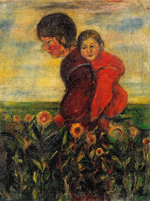 ひまわりを思わせる花々が咲き乱れる野辺と、そこにたたずむ子守の少女。近所に住む子供をモデルにしたというこの作品は、関根の幼い頃の記憶をもとにした、一種の構想画であると考えられています。少女が背負う赤子の、年齢の割に大人びた表情は、それが関根自身であることを暗示しているようです。しばしば<幻視の画家>と評されるように、関根正二の最晩年の作品には、幻想的かつ宗教的な性格が色濃く漂います。この『姉弟』では、過去の記憶をイコン(聖像画)のように封じ込めることで、彼の憧れたユートピア的世界が表現されており、彼の愛したヴァーミリオン(朱色)が、ここでも象徴的な役割を果たしています。