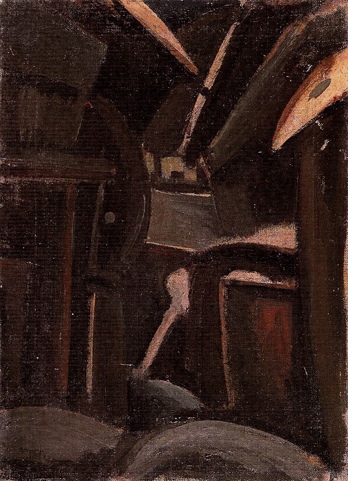 万鉄五郎は、1914年9月に家族とともに故郷の岩手県・土沢に帰り、孤独な制作に没頭する生活を送ります。彼は土沢の風景に接しながら、それを写実的に表現するのではなく、自然の奥底にひそむ生命力や形象を抽象化し、いったん自らの造形言語におきなおして画面を組み立てていったのです。この作品はそうした土沢での研究が実を結んだ作品の一つです。フォーヴィスム風の荒々しいタッチはまだ見られますが、強烈な色彩は影をひそめ、褐色を中心とした重厚な存在感がまず目を奪います。立体を二次元の平面に再構築して定着させるというキュビスムの方法を用いながら、そこに彼独特のうるおいのある筆づかいが生彩を放っています。
