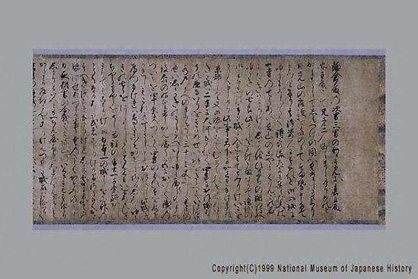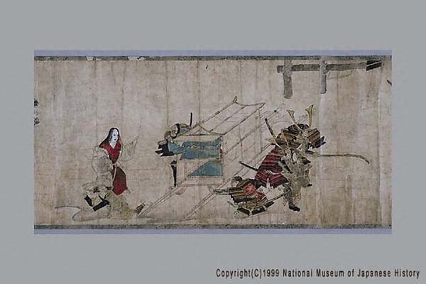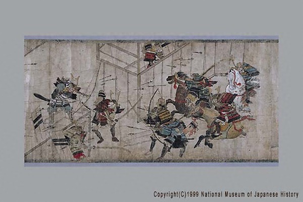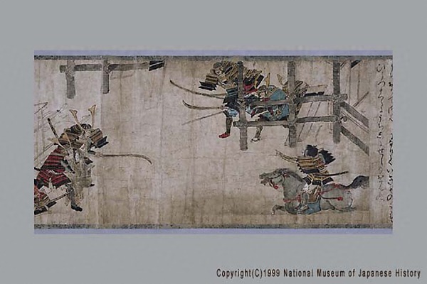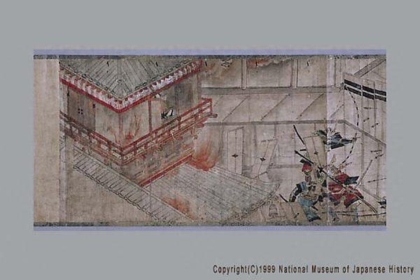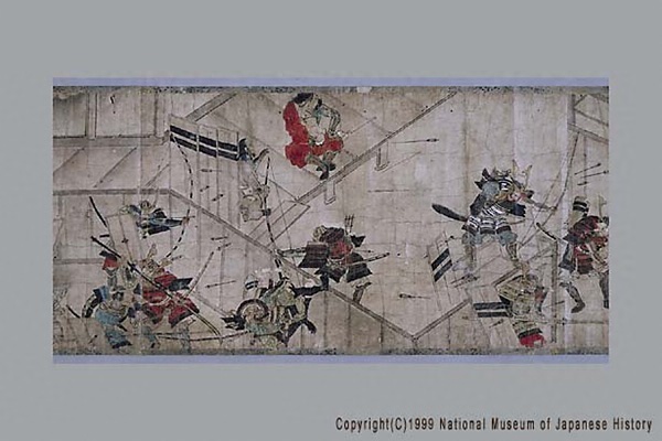 「結城合戦絵詞」は、永享の乱で関東管領と幕府の軍に敗れて自害した鎌倉公方足利持氏の遺児春王丸と安王丸が、結城氏朝・持朝父子に擁立されて起こした永享12年から嘉吉元年(1440~41)にかけての反乱を主題とした絵巻。この戦いで氏朝・持朝は敗死し、遺児らは捕らえられ殺された。現状残るのは2場面で、幕府軍と持氏軍の戦いで敗れた持氏が炎上する館内で割腹する場面と、幕府軍と結城軍の戦いで敗れた結城方が女装させた遺児らを落ち延びさせようとする場面。本絵巻の詞書は、長享2年(1488)に成立した『鎌倉殿物語』のそれと共通する部分が多い。