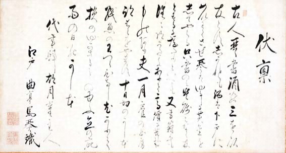 江戸の高名な戯作者である曲亭(滝沢)馬琴が、名古屋の代表的な貸本屋大惣(大野屋惣八・胡月堂)のもとを訪れた際に、貸本屋の宣伝文句として、主人に代わりこれを書いた。彼は貸本を、夕立の時の雨宿りの軒先と同様、借りて損のないものと、うまく例えている。この口上書は、大惣の店先に掲げられていたと伝えられている。