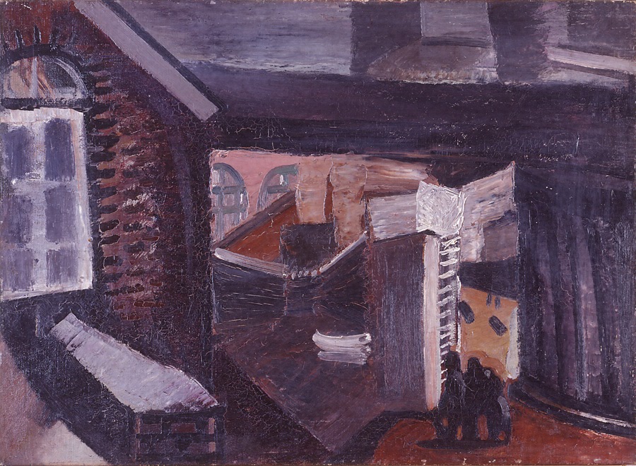 この絵が制作されたと想像される1924年は、前田寛治がパリに留学して一年たった頃で、1925年に帰国することになっているから、滞欧生活のほぼ中間にあたる。佐伯祐三(1898-1928)や里見勝蔵(1895-1981)をはじめ、パリ在住の画家で前田自身が「パリーの豚児」と名付けた仲間たちと羽目をはずす、そんな快活な一面も前田にはあったが、その一方で旧友の感化をうけつつ、労働者や工場などにモチーフをしぼった社会主義的レアリスムの画風が気になっている頃でもある。 この《風景》の全体からうける沈鬱な印象は、労働者のいる街の風景という設定からというより、大器晩成ともみえる前田の、それこそ個性のつよさによっているのだろう。ごたごたして稚拙ともみえる空間の処理と、ずっしりと手に重い色彩の感覚。愉悦にみちた一瞬をとらえるのは不得手かもしれないが、かれの才覚はもっと別の、風雪に耐えて生きるところにあった。たとえばその色彩にしてもそうである。くりかえしみているうちに、これはこれでうつくしいと納得することになる、何度みてもあきない不思議な色彩なのである。 (東俊郎)