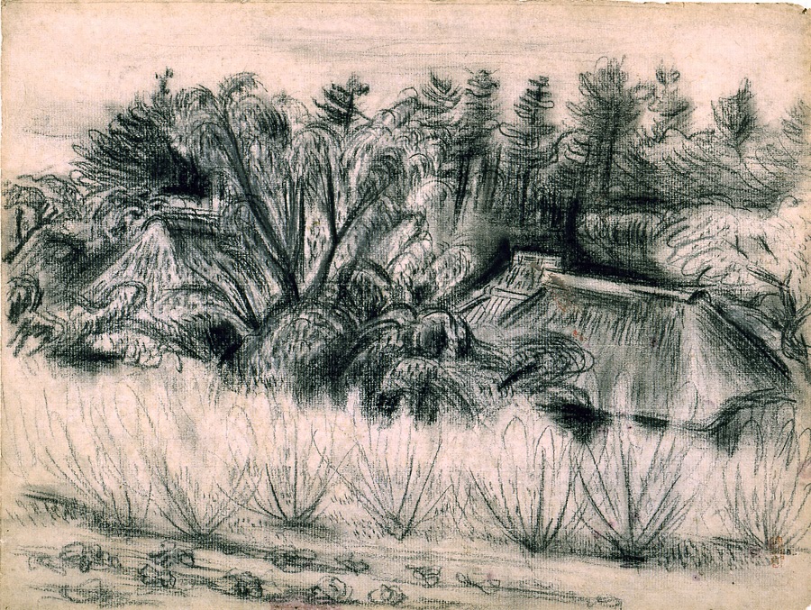 少し高い前景からやや身をひいて、木立にかこまれた家をみおろした構図は、かれの故郷岩手県の土沢をえがいた『木の間から見下ろした町』『かなきり声の風景』『木の間風景』(いずれも1918年作)などの油彩作品をはじめ、萬にはよく登場する。