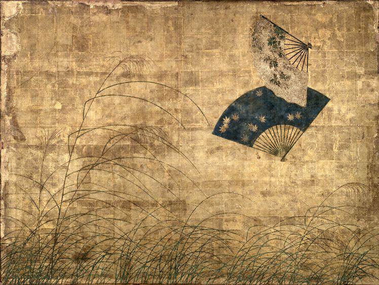 菊花図は、画面左方に土坡を背景として大小の垣根と白菊、紅菊を配し、中央部には流水を大きく描く。この部分では花の割合は少なくなっており、花自体も小ぶりである。右方には、柴垣に紅白の菊が配されている。右部分の花が柴垣とともに右からの風になびいているなど、全体に変化にとむ構成となる。扇面諸図は、左より、菊薄図(泥絵)、薄に萩図、桃図、波涛図、枯木に宿鳥図(墨画)、桔梗に薄図、雷文図、山水図(墨画)、墨竹図、楼閣山水図(墨画)、柴垣に蔦図、木瓜に小禽図、楼閣山水図(墨画)を描く計十三面である。