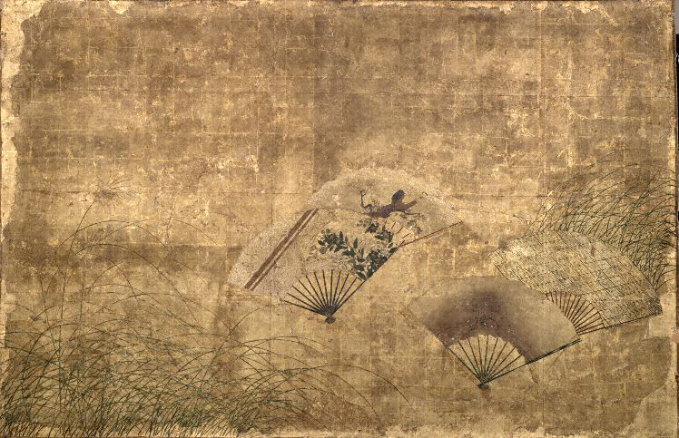 菊花図は、画面左方に土坡を背景として大小の垣根と白菊、紅菊を配し、中央部には流水を大きく描く。この部分では花の割合は少なくなっており、花自体も小ぶりである。右方には、柴垣に紅白の菊が配されている。右部分の花が柴垣とともに右からの風になびいているなど、全体に変化にとむ構成となる。扇面諸図は、左より、菊薄図(泥絵)、薄に萩図、桃図、波涛図、枯木に宿鳥図(墨画)、桔梗に薄図、雷文図、山水図(墨画)、墨竹図、楼閣山水図(墨画)、柴垣に蔦図、木瓜に小禽図、楼閣山水図(墨画)を描く計十三面である。