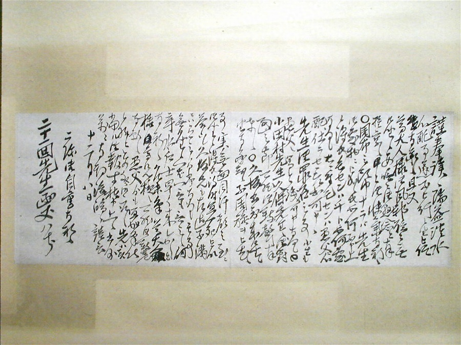 前原一誠が師の吉田松陰に送った書簡。この当時、前原は佐世八十郎と称していた。安政5年(1858)、松陰は幕府の日米条約無勅許調印に憤慨し、老中暗殺を計画する。一方、周布政之助ら藩政府はそれを封ずるため、同年12月5日、松陰の再投獄を決定した。このため、前原・吉田稔麿・入江九一ら8人の塾生が周布らの邸宅に抗議に押しかけたが、6日、全員謹慎に処された。前原はこの書簡で松陰に対し、久坂玄瑞から不尽力を責められたことに対し、「実に面目なく汗顔の至りに候えども、時宜を得、一死をもって答え申し候」と述べる。