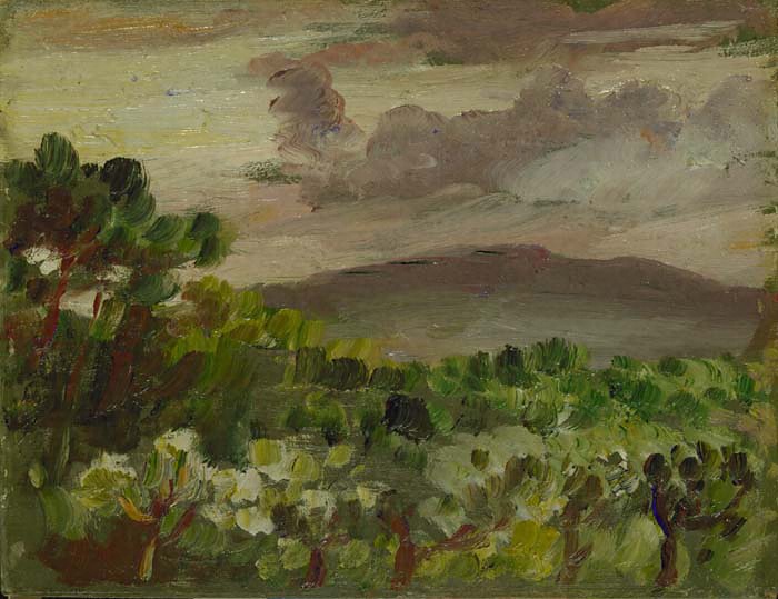 大正8(1919)年8月から9月にかけて、鎌倉に滞在したときに制作されたものである。《夕の梨畑》は、近景に梨畑を描き、遠景に淡橙色の空に富士山を望んだもの。《夕の原》《夕の景》と3点で組み合わせてある。