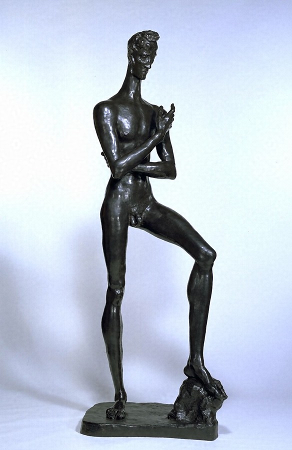 ドイツ・ドゥイスブルク郊外のマイデリッヒに生れる。デュッセルドルフの美術工芸学校を経て、1901年から1907年まで同市のアカデミーで学んだ。初期はベルギーのムーニエの影響もあって労働者など社会的主題の作品を制作したが、1905年頃ロダンを知り、その表現を学びながら感傷的、内省的な趣を見せ始めた。1910年に移り住んだパリではマイヨールの影響も受けたが、モディリアーニ、アーチペンコ、ブランクーシといった作家たちと交流する中で、細長く引き伸ばした新しい人体造形に強い精神性を結びつけた独特の作風を確立、ドイツ表現主義を代表する彫刻家となった。1919年にプロイセン芸術アカデミー会員に推されたが自殺、戦争に対する苦悩と、造形と感情という芸術上の相克のためといわれる。 レームブルックの細長い人体はまず女性像に用いられ、メランコリックな表情や、傾けた首に始まるゆったりとした動勢に適していた。これに対して、この男性像では踏み出した左側と胸の前で組んだ腕が大きな空間をつくっている。この青年は作者の精神的自画像といえるが、長い肢体は個人を超越した存在を感じさせ、未来に新しい人類共同体を夢みたパリの芸術家の精神を象徴している。深刻な表情と指や間接などの生気が、世界を背負って高みに向かう者の犯し難い霊感を像にまとわせている。しかし第一次世界単線後この青年は、四つんばいで地に頭を垂れる《戦死者たち》(1915/16年)やうなだれる《坐る青年》(1916/17年)などのように、悲劇性を強めていくこととなった。(M.T.)