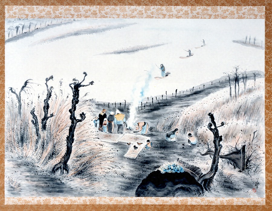 江戸で生まれる。1880年頃から本多錦吉郎の画塾で洋画を学び、日本画も独習した。1893年に茨城県牛久村に帰り、農業に従事。各種新聞雑誌に農民を主題とした風刺的な漫画や挿絵を描く。1917年に日本美術院同人に推され、以後院展に湖畔や田園を主題にした日本的な郷愁を誘う作品を発表する。農本主義的思想から農画工と自称し、「河童の芋銭」という異名のとおり河童をはじめとする不可思議な生物たちの生態を水郷の生活伝承にあわせて表現し、独特の幻想世界を創造した。 1922年の院展に出品された《沼四題》は、大正期の芋銭の代表的な作品で、〈檜原〉〈泥鱒打〉〈家鴨小屋〉〈小鰕網〉の四つの異なる主題を扱っている。〈小鰕網〉は四題のうちで内容的にも色彩的にももっとも多彩な作品である。老若男女が煙をたなびかせる焚火にあたり、その後ろでは捕りたての小鰕がむしろの上で天日干しされ、沼では捕れたての小鰕を乗せた舟が戻ってくる。前景には葉を落とした木々がまるで妖怪のような姿を見せている。春山武松は院展評で《沼四題》について「遺憾なく自らの境地を示してゐるが、其枯淡なる筆致と、其単純なる表現とを、静かに味はふ時は、尽きざる興趣が湧くのを覚えるであらふ」と記した。(F.H.)