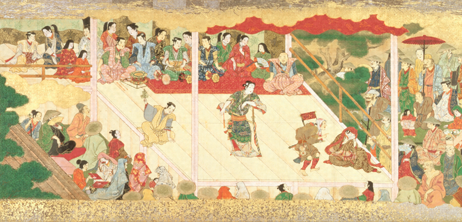 出雲阿国が、慶長八年(一六〇三)京都で始めた派手で異様な扮装を特色とした「かぶき踊り」は、たちまち流行となり、多くの追随者が生まれた。本図の主人公采女もその一人である。京都の四条河原で評判を得た次第が記され、五種の歌謡の詞書とそれに対応する踊の図が続き、最後に歌舞伎礼賛の詞と釆女が男装して踊る場面が描かれる。初期の「かぶき踊り」の様相が知られるばかりでなく、南蛮人や楽屋内での食事、門前の物売りなど当時の風俗を知る上でも貴重な作品である。本図に使用された料紙の装飾法は、慶長期に製作された「稲富流砲術伝書」(大和文華館蔵)の見返しや「伊達政宗書状 ローマ法王宛」(ヴァチカン図書館蔵)のうちラテン文の料紙と同工房とみられ、本作品もこれらとほぼ同時期の作と考えてよい。