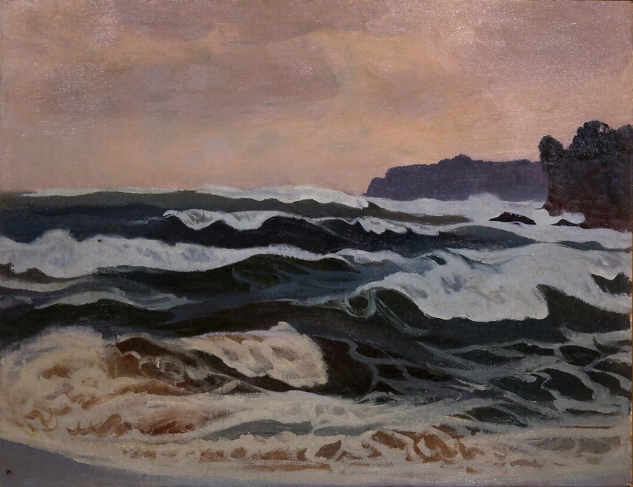 空、波など各部に黄、緑などが混ぜられているが、全体は明るいグレーの変化としてまとめられており、強い色を避けてある。塗りは薄いが、透明感はない。筆致も動きを生むというほどのものではない。主張が乏しいともいえよう画面は、しかし、一種奇妙な雰囲気をたたえている。