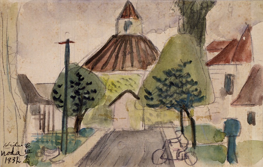 この小品「風景」も、こんな風に家があり、こんな風に自転車が道を横ぎっただろうアメリカのどこかの一風景である。一見、松本竣介みたい、と感じる人がいてもおかしくはない。松本竣介は野田から多くのものを得ているし、社会への関心と人間への興味にははじめから通底するものがあったので、その上で松本はあの透明で静かな世界にたどり書いたのである。(東俊郎)