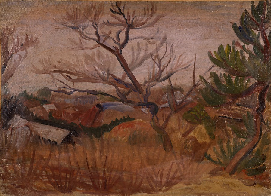 「枯木の風景」は、おそらく茅ヶ崎の風景を描いたものであろう。ゆるやかで骨太く感じられる筆さばきには、油絵による文人画の趣が表明されている。