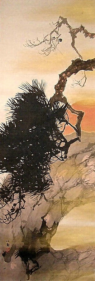 縦長の画面には、大木を思わせる風格のある松の一部が、四条派の伝統でもある輪郭線を用いない没骨法で大胆に描かれる。前景の下垂した枝と密集した葉、そのやや後方には太い幹、遠景には朝日が輝き、画面の奥行きとともに淡い色彩となっている。晩年の作ながら力強さを感じさせる。