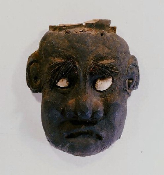長さ35.5cm 宮城県中新田町。 カマ神はカマ男ともいわれ、家の神様として竈の上に飾られます。宮城県から岩手県県南部にかけて見られる独特の習俗です。このカマ神は土製で、目に卵、眉に藁を用いている点に特徴があります。宮城県指定有形民俗文化財