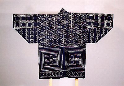 木綿布に白糸で麻の葉・七宝などの幾何学的模様に刺したものです。堰普請や建前などの共同作業に着用しました。
