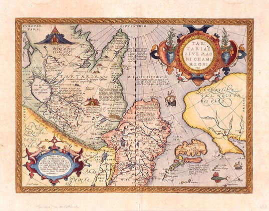 アントワープ生まれの地図製作者オルテリウスが1570年に出版した世界地図帳『世界の舞台』に所収されたモンゴル周辺、タルタリア族が住むといわれていた地域を描く地図。日本はアジア大陸と北アメリカ大陸のほぼ中間に東西に長い島として描かれ、その形はアジア図とほぼ同じである。