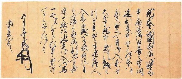 永禄12年(1569)今川氏真の掛川城を攻め落とした徳川家康配下の酒井忠次に、北条氏政が宛てた書状で、掛川城を出る氏真に忠次が付き添ったことを喜び、以後は何事も家康と相談するから、しかるべきように斡旋していただきたいと忠次に宛てた書状である。