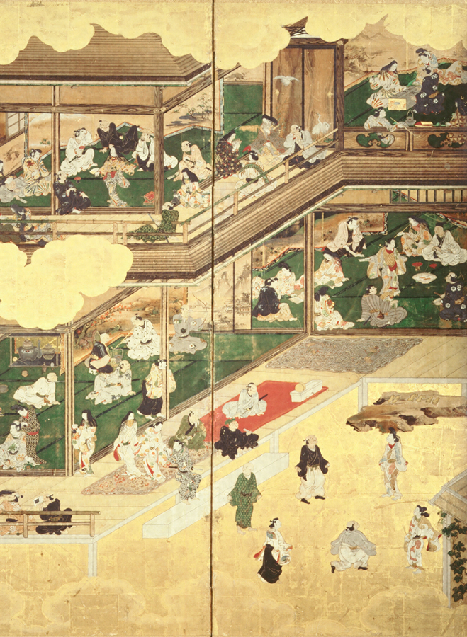 両隻にわたって、人々がありとあらゆる遊楽に打ち興じ、太平の世を満喫するさまが繰り広げられる。流麗な人物描写もさることながら、様々な遊楽を破綻なくまとめた構成力、見る者を引き込む細密描写とにより、本図は近世初期に描かれた妓楼遊楽図の中でも最も初発的な作品と位置づけられる。本図は、初代義直が母お亀の方(相応院・家康側室)の追福のために建立した相応寺に伝えられたことから、相応院の遺愛品であると唱えられてきたが、記録としては三代綱誠の十九男松平通温(一六九六-一七三〇)の遺愛品として寺に納められたことが判明している。
