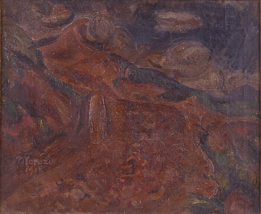 この作品は、道のはるか前方に大きな山が見え、暗く見える空には雲が浮かんでいることから、よく晴れた晴天の日の風景であることが分かるであろう。力強い輪郭線をもつ山の描写などから、キュービスムの様式との類似点が指摘される。