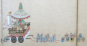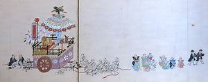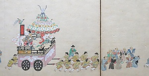 しほんちゃくしょくたかおかみくるまやまさいれいぎょうれつえまきびょうぶ
