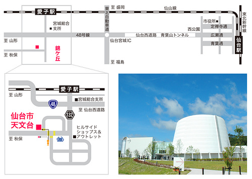 JR仙山線、愛子駅下車。「上の原」「野尻町北」「二口温泉」行き(市営)、または「錦ケ丘八丁目」行き (愛子観光路線バス)で約10分「錦ケ丘七丁目北・天文台入口」下車、徒歩3分。なお、仙台市天文台そばには横断歩道がないので、バス停そばの横断歩道を渡ってからお越しください。