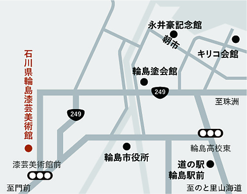 バ ス:金沢駅から北陸鉄道奥能登バス輪島特急で約120分、道の駅・輪島ふらっと訪夢「輪島駅」下車、「輪島駅」よりのらんけバス海コースにて「漆芸美術館」下車。