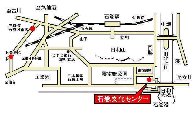 宮城交通バス使用:石巻駅前より山下廻り、門脇廻りとも文化センター前下車、タクシー利用:石巻駅より約10分
