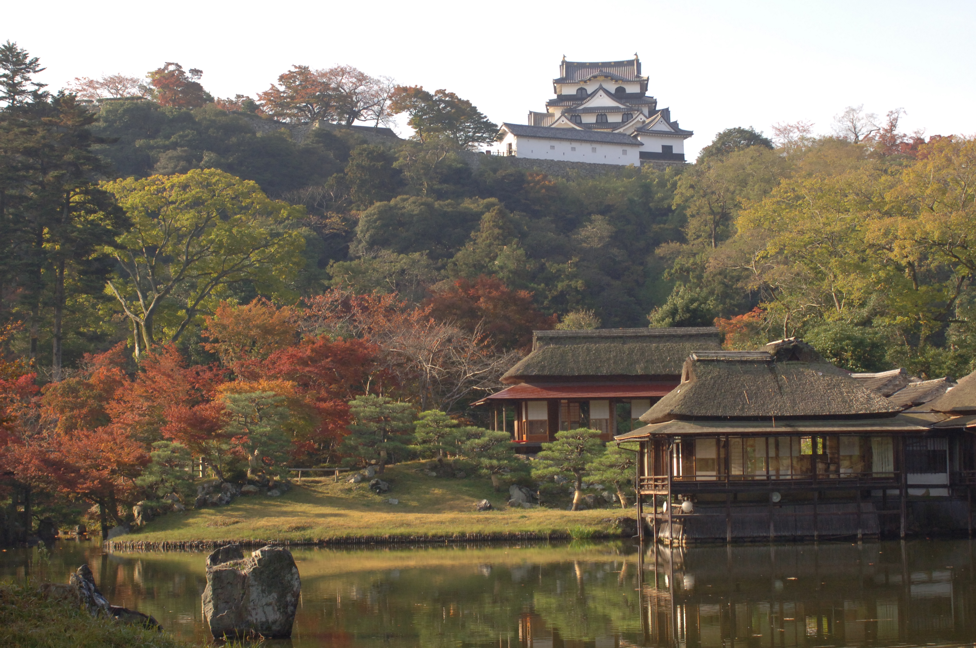 内郭は丘の自然地形を巧みに活かして城郭の防御的部分と城主の居館を築き、外郭には位の高い武家の屋敷を配しました。外郭の周囲にも濠が巡り、外側には一般居住地と商業地からなる城下町があり、そのさらに外側にも濠が巡っていました。内・外郭には、天守・櫓・門などの城郭建築と居館の庭園である楽々園及び玄宮園が残り、二重の濠と石垣・城壁が良好に保存されています。